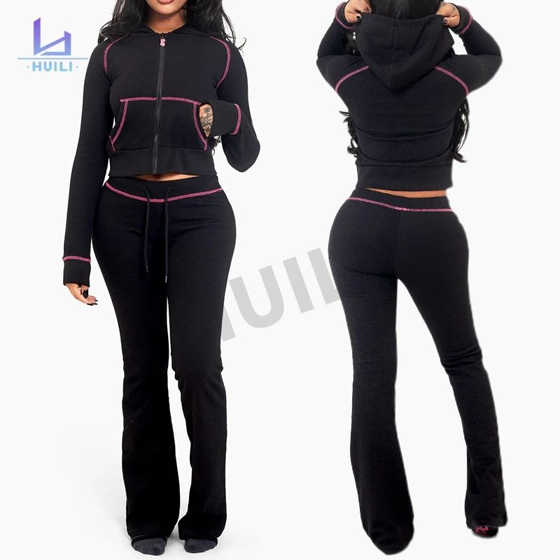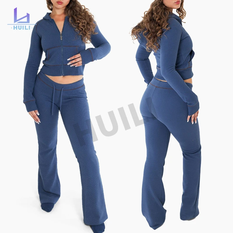 Huili Custom LOGO Solid Color Waffle Tracksuit Thick Heavyweight Zip up Two Piece Flared Sweatpants Crop Top Hoody Set for Women